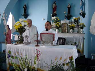 Recebendo a comunhão do Pe. LEANDRO ARAÚJO, o Deputado Federal e Secretário de Estado da Ação Social - RAIMUNDO GOMES DE MATOS. Dr. RAIMUNDO MATOS foi médico de nossa instituição e é um colaborador fiel.